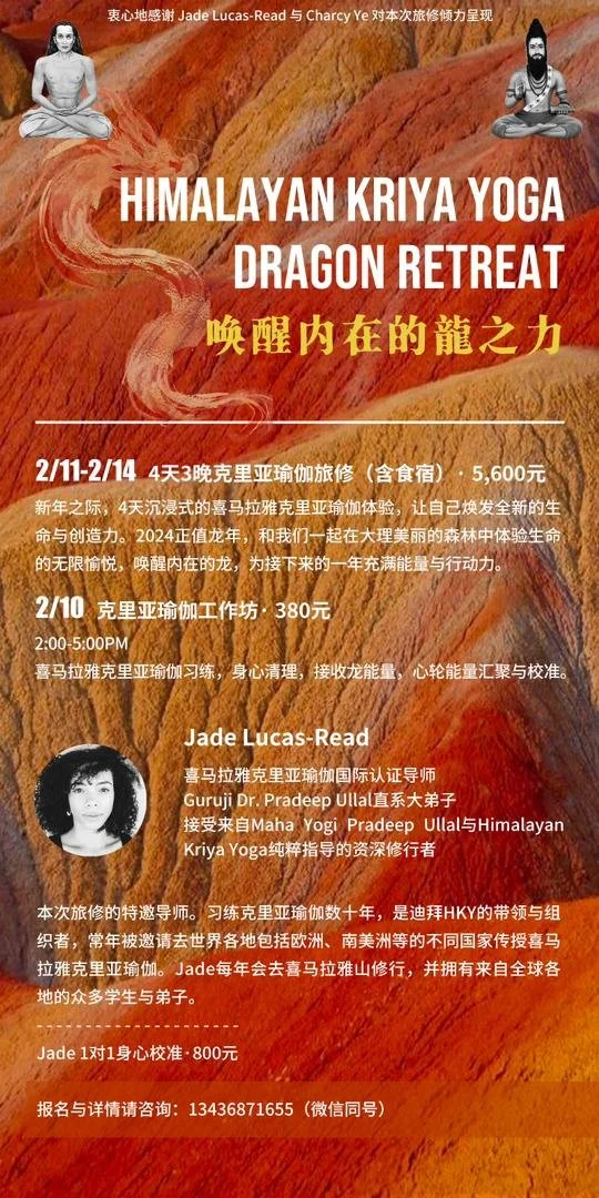 We are excited to announce that, in the firey mountains of China, lead facilitator Jade Lucas-Read will be offering Himalayan Kriya Yoga Dragon Retreat.